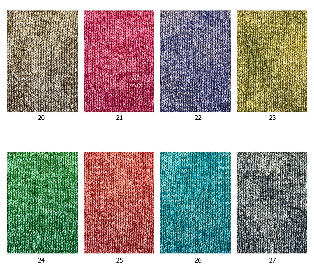 La particularité d’Acquerello réside dans sa coloration micro‑spray : de fines pulvérisations de couleur appliquées de manière irrégulière sur le fil. Ce procédé crée un effet tie‑dye subtil, plus léger et plus moderne que les dégradés traditionnels.